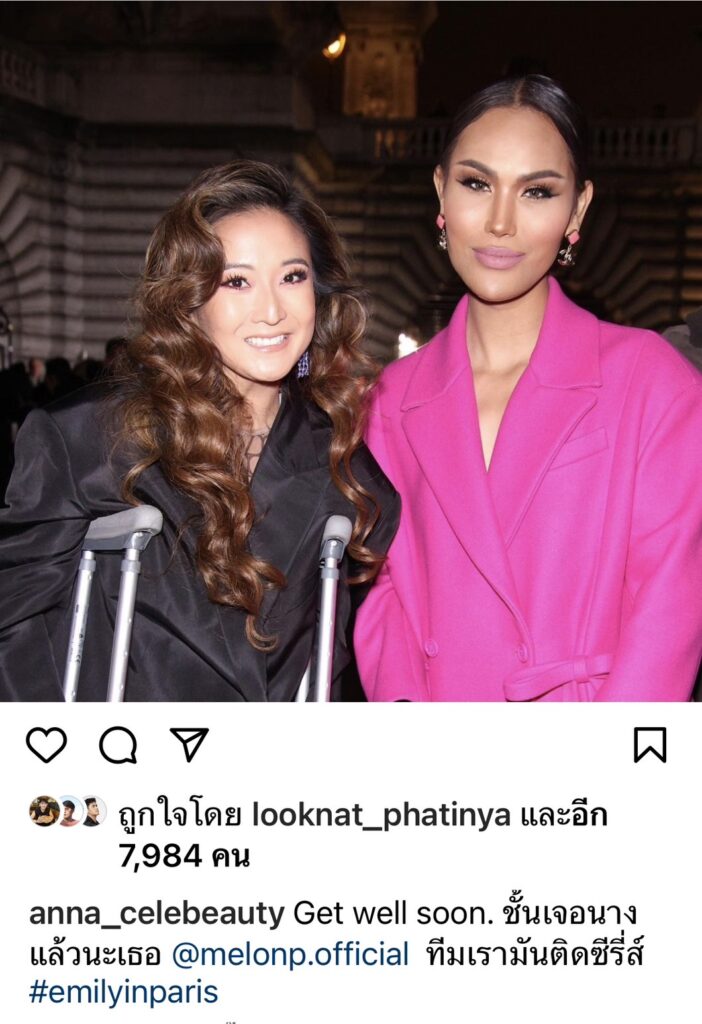 แต่งานนี้ เจ้าตัวยังออกมาโพสต์ เจอทุกแม่ ทุกสถาบัน มารวมกันที่โชว์ Valention แถมยังโพสต์ผ่าน Instargram ฝากข้อความถึงเพื่อนรัก แตงโม นิดา “Get well soon ชั้นเจอนางแล้วนะเธอ @melonp.official ทีมเรามันติดซีรีส์ #emilyinparis