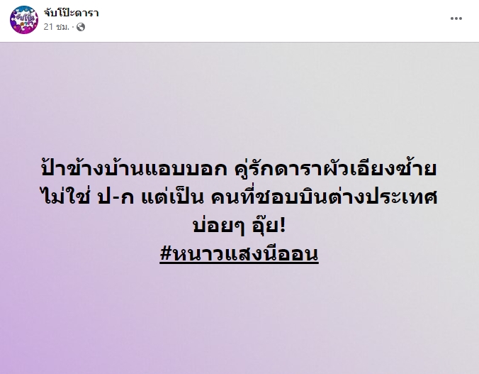 ล่าสุดเพจดัง จับโป๊ะดารา ได้ออกมาโพสต์ คำใบ้เพิ่ม ว่า “ป้าข้างบ้านแอบบอก คู่รักดาราสามีเอียงซ้าย ไม่ใช่ ป-ก แต่เป็นคนที่ชอบบินต่างประเทศบ่อย ๆ อุ้ย! #หนาวแสงนีออน” งานนี้ชาวเน็ตต่างพากันคาดเดาและแสดงความคิดเห็นอย่างมากมาย ส่วนคู่รักดังกล่าวจะเป็นคู่ไหนนั้นก็ต้องติดตามกันต่อไป