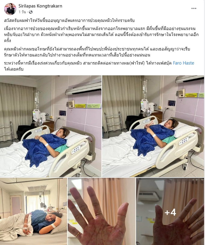 ทำเอาแฟนๆแห่แสดงความเป็นห่วง หลังจากวานนี้ นักแสดงสาว หมิว สิริลภัส ได้ออกมาโพสต์ภาพตัวเองพร้อมกับเผยให้เห็นผื่นที่ขึ้นบริเวณมือและเท้า พร้อมข้อความว่า