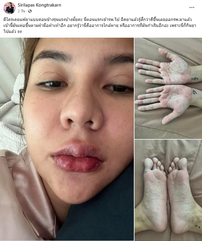 “มีใครเคยแพ้ยาแบบค่อนข้างรุนแรงบ้างมั้ยคะ นี่ตอนแรกเข้าโรงพยาบาลไป ฉีดยาแล้วรู้สึกว่าดีขึ้นเลยออกโรงพยาบาลมาแล้ว มันเห่อขึ้นตามฝ่ามือฝ่าเท้าอีก อยากรู้ว่านี่คืออาการใกล้หาย หรืออาการที่มันกำเริบอีกอ่ะ เพราะนี่ก็กินยาไปแล้ว งง”
