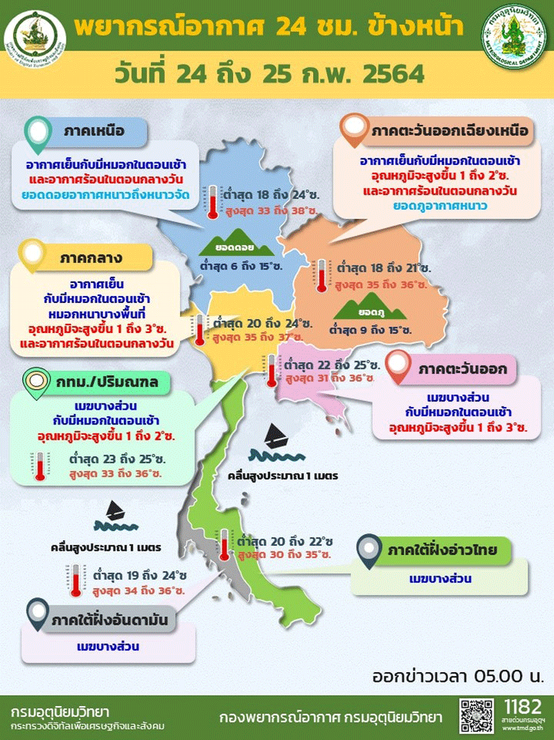 สำหรับภาคใต้และอ่าวไทย มีลมตะวันออกพัดปกคลุม ทำให้มีฝนน้อย อนึ่ง วันที่ 25-26 ก.พ. 2564 ลมตะวันตกในระดับบนพัดพาอากาศเย็นจากประเทศเมียนมาเข้ามาปกคลุมภาคเหนือ จะทำให้บริเวณดังกล่าวมีอุณหภูมิลดลง 1-3 องศาเซลเซียสในตอนเช้า