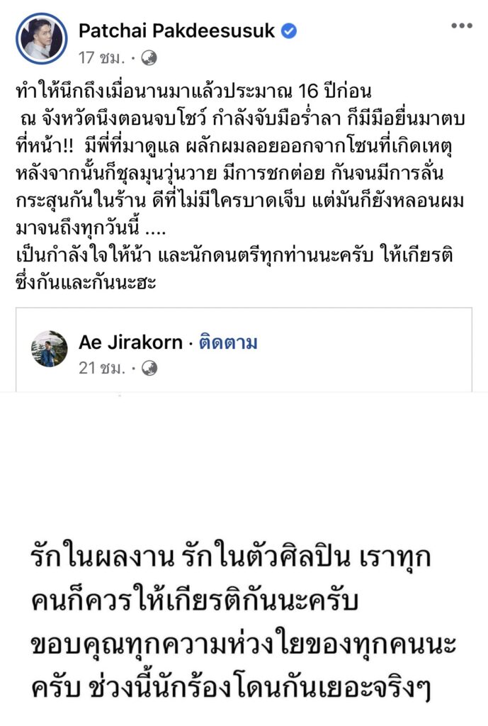 “ทำให้นึกถึงเมื่อนานมาแล้วประมาณ 16 ปีก่อน… ณ จังหวัดนึงตอนจบโชว์ กำลังจับมือร่ำลา ก็มีมือยื่นมาตบที่หน้า!! มีพี่ที่มาดูแล ผลักผมลอยออกจากโซนที่เกิดเหตุ หลังจากนั้นก็ชุลมุนวุ่นวาย มีการชกต่อย กันจนมีการลั่นกระสุนกันในร้าน ดีที่ไม่มีใครบาดเจ็บ แต่มันก็ยังหลอนผมมาจนถึงทุกวันนี้ …. เป็นกำลังใจให้น้า และนักดนตรีทุกท่านนะครับ ให้เกียรติซึ่งกันและกันนะฮะ”
