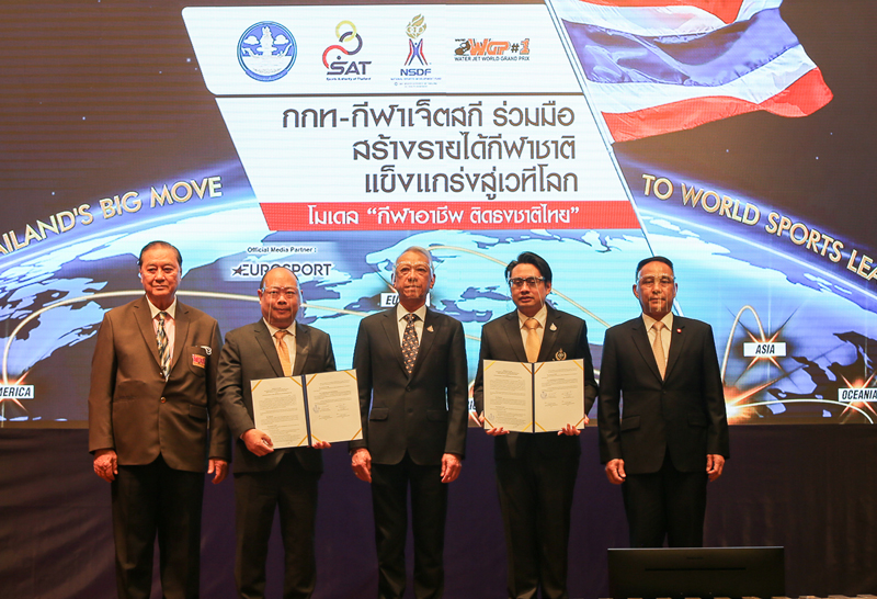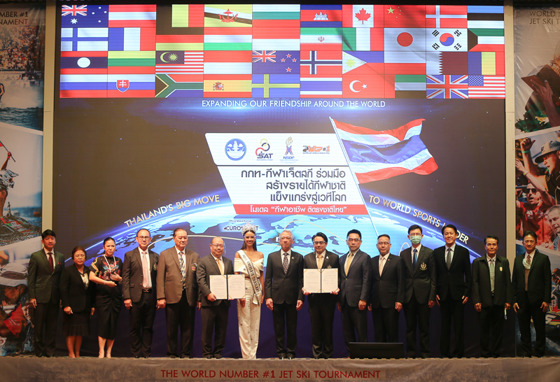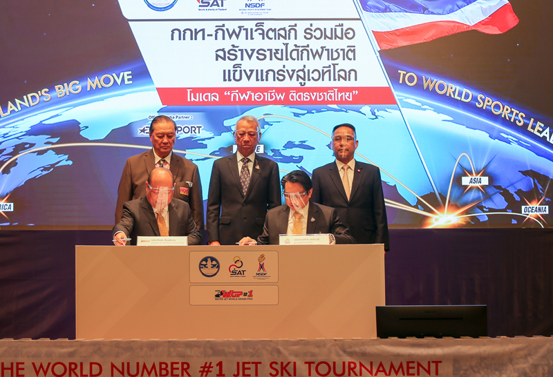 จากการที่การกีฬาแห่งประเทศไทย ได้ทำบันทึกความร่วมมือ (MOU) กับ บริษัท เอเชี่ยนมัลติสปอร์ตแอนด์ เอ็น-เตอร์เทนเม้นท์ จำกัด เจ้าของลิขสิทธิ์ทัวร์นาเม้นท์เจ็ตสกีเวิลด์คัพและเวิลด์ซีรี่ส์ โดยมี ฯพณฯพิพัฒน์ รัชกิจประการรัฐมนตรีว่าการกระทรวงการท่องเที่ยวและกีฬา เป็นประธานในพิธี ร่วมด้วย นายปริเขต สืบสหการ เจ้าของลิขสิทธิ์การจัดการแข่งขันเจ็ตสกีอาชีพ WGP#1 ลงนาม (MOU) การทำความตกลงการให้การช่วยเหลือ การส่งเสริมหรือการสนับสนุน กีฬาเจ็ตสกีอาชีพของไทยภายใต้ชื่อโครงการ “กีฬาอาชีพ ติดธงชาติไทย” โดยมี ดร.ก้องศักด ยอดมณี ผู้ว่าการการกีฬาแห่งประเทศไทยนายเขมพลอุ้ยตยะกุล เลขานุการรัฐมนตรีว่าการกระทรวงการท่องเที่ยวและกีฬา นายขจร เจียรวนนท์ นักบริหารธุรกิจ และนักบริหารกีฬาระดับชาติ นายณัฐวุฒิ เรืองเวสกรรมการการกีฬาแห่งประเทศไทยฯ นายทนุเกียรติ จันทร์ชุม ผู้อำนวยการฝ่ายกีฬาอาชีพการกีฬาแห่งประเทศไทย พลตำรวจเอก เดชณรงค์ สุทธิชาญบัญชารองประธานคณะกรรมาธิการการกีฬา วุฒิสภา นางสาวฐาปนีย์ เกียรติไพบูลย์ รองผู้ว่าการด้านสินค้าและธุรกิจท่องเที่ยว นางจริยา ชุมพงศ์ ผู้เชี่ยวชาญเฉพาะด้านนโยบายและยุทธศาสตร์สำนักนโยบายและแผน สำนักงานปลัดกระทรวงมหาดไทย นายภเชศ จารุมนต์ หัวหน้าศูนย์ให้คำปรึกษาด้านทรัพย์สินทางปัญญาและนวัตกรรม (IP IDE Center) นักวิชาการพาณิชย์ชำนาญการนายสนิท วรปัญญา นายกสมาคมกีฬาเจ็ตสกีแห่งประเทศไทยฯร่วมเป็นเกียรติในงานณ ห้องประชุมชั้น 25 อาคารเฉลิมพระเกียรติ 7 รอบ พระชนมพรรษา การกีฬาแห่งประเทศไทย