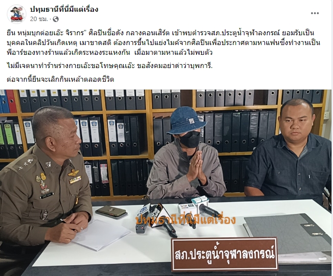 ล่าสุดทางเพจเฟซบุ๊ก “ปทุมธานีที่นี่มีแต่เรื่องง ได้ออกมาโพสต์ภาพหนุ่มปริศนาที่ขึ้นต่อยหน้า เอ๊ะ จิรากร ได้เข้ามอบตัวกับตำรวจแล้วพร้อมระบุแคปชั่นว่า..