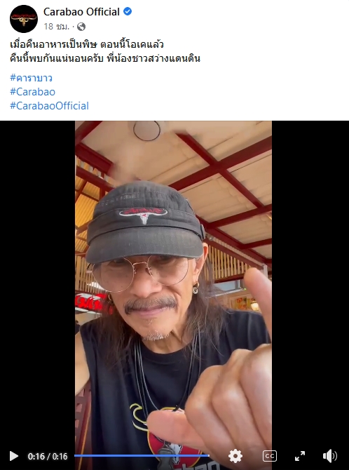 ล่าสุด แอ๊ด คาราบาว ได้อัดคลิปสั้นๆฑณ็ฮฒโพสต์ผ่านเพจ CaraBao Official เล่าถึงเหตุการณ์ดังกล่าวว่า “เมื่อคืนนี้อาหารผมเป็นพิษ กินแฮมเบอร์เกอร์ แล้วมันมีแตงกวาดอง โอ้โหแทบตาย แต่คืนนี้หายแล้ว พบกันแน่นอนครับพี่น้อง” ท่ามกลางแฟนคลับที่เข้ามาส่งกำลังใจให้อย่างล้นหลาม