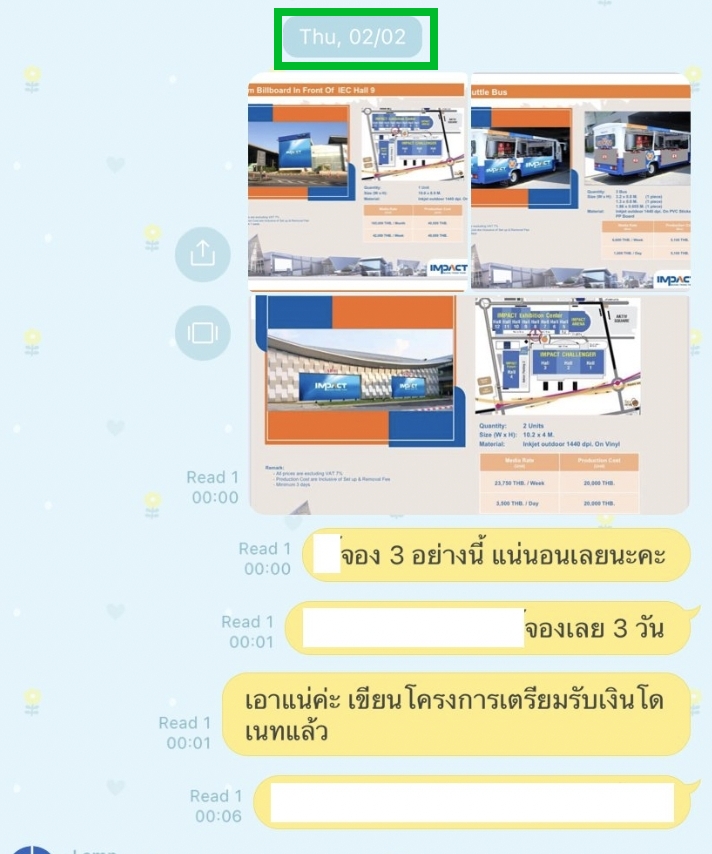 - 3 กุมภาพันธ์ : บ้านเบสจุนกยู ติดต่อเพื่อขอจองป้ายกับ พนักงานเซลล์ของอิมแพคฯ(คนเดียวกับที่คุยซื้อ–ขายกับบ้านเบสเตนล์) โดยขอซื้อจำนวน 2 ป้าย ซึ่งซ้ำกับที่บ้านเบสเตนล์จองไว้
