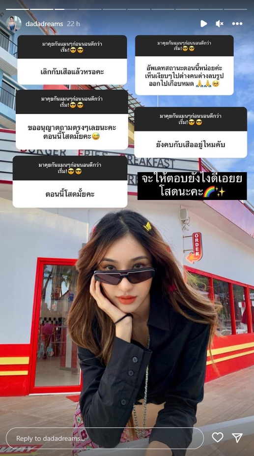 ล่าสุดสาวดรีมเปิดโอกาสให้แฟน ๆ ตั้งคำถามเรื่องราวต่าง ๆ ในไอจีสตอรี่ ซึ่งก็มีคนเข้ามาถามถึงประเด็นนี้ด้วยว่า  เลิกกับเสือแล้วเหรอคะ, ตอนนี้โสดไหมคะ, ยังคบกับเสืออยู่ไหมครับ, อัปเดตสถานะตอนนี้หน่อยค่ะ โดยด้านสาวดรีมก็ตอบแบบชัด ๆ ไว้ว่า “จะให้ตอบยังไงดีเอ่ยย โสดนะคะ”