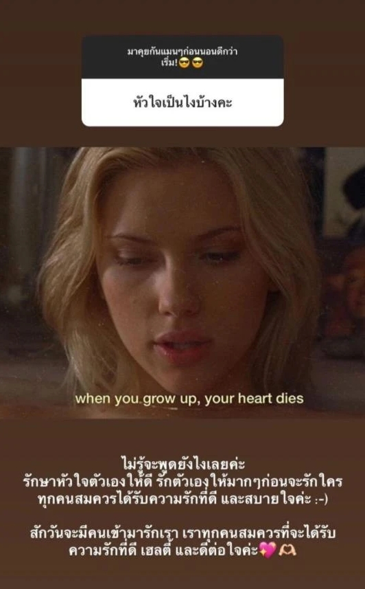 นอกจากนี้ยังมีคนเข้าไปถามต่ออีกว่า “หัวใจเป็นไงบ้างคะ?” ซึ่งคำตอบของคำถามนี้ “ดรีม” ก็บอกว่า “ไม่รู้จะพูดยังไงเลยค่ะ รักษาหัวใจตัวเองให้ดี รักตัวเองให้มากๆ ก่อนจะรักใคร ทุกคนสมควรได้รับความรักที่ดี และสบายใจค่ะ สักวันจะมีคนเข้ามารักเรา เราทุกคนสมควรที่จะได้รับความรักที่ดี เฮลตี้ และดีต่อใจค่ะ”