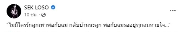 ล่าสุด เสก โลโซ ออกมาความเคลื่อนไหว พร้อมโพสต์ข้อความถึงลูกชายว่า “ไม่มีใครรักลูกเท่าพ่อกับแม่ กลับบ้านนะลูก พ่อกับแม่รออยู่ทุกลมหายใจ…”