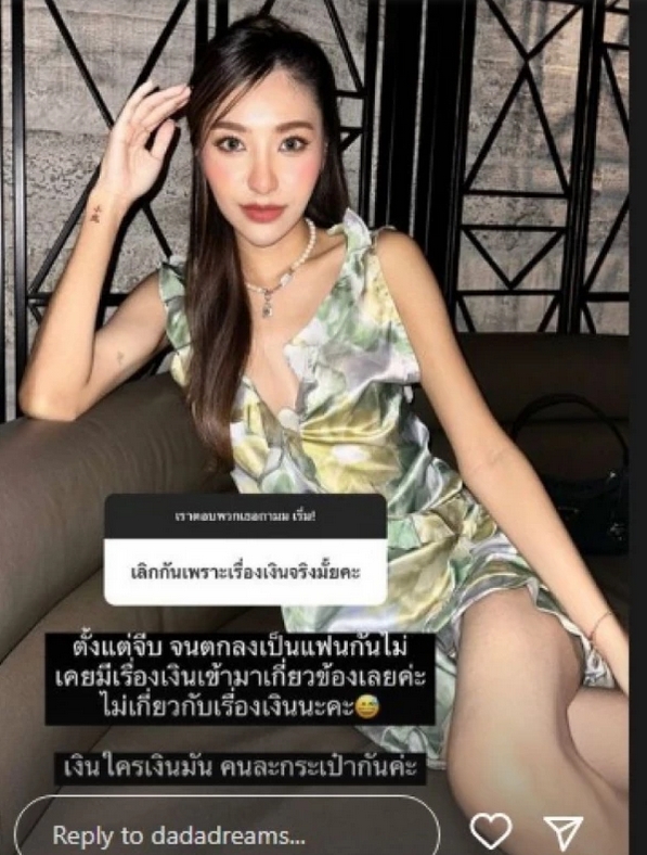 โดย ดรีม ได้ตอบว่า “จะให้ตอบยังไงดีเอยย โสดนะคะ”, “ไม่รู้จะพูดยังไงเลยค่ะ รักษาหัวใจตัวเองให้ดี รักตัวเองให้มากๆ ก่อนจะรักใคร ทุกคนสมควรได้รับความรักที่ดี และสบายใจค่ะ สักวันจะมีคนเข้ามารักเรา เราทุกคนสมควรที่จะได้รับความรักที่ดี เฮลตี้ และดีต่อใจค่ะ”
