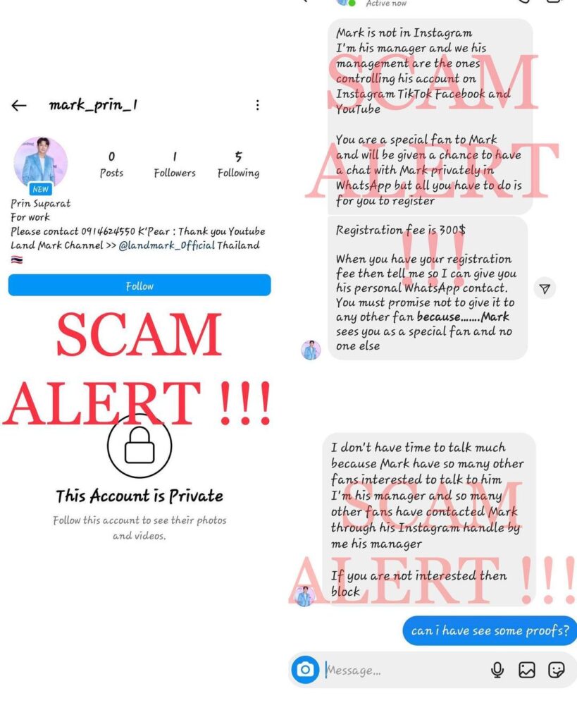 มิจฉาชีพกำลังระบาดและมาในทุกรูปแบบ โดนกันถ้วนหน้าทุกวงการเลยจริงๆ ล่าสุด “แพร ภรณ์มณี” ผู้จัดการของหนุ่ม “หมาก ปริญ” ได้ออกมาเผยผ่านอินสตราแกรมส่วนตัว มิจฉาชีพได้แอบอ้างชื่อของพระเอกหนุ่ม หลอกให้แฟนๆ ลงทะเบียน เพื่อที่จะได้เข้าระบบแชทคุยกับหนุ่ม “หมาก” แบบส่วนตัว