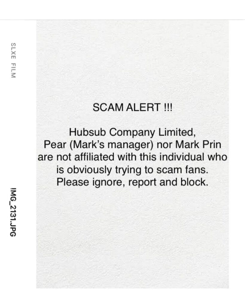ซึ่งงานนี้ผู้จัดการสาวก็ได้เผยภาพเตือนภัยลงอินสตาแกรมส่วนตัว พร้อมกับแนบข้อความระบุว่า… “แจ้งเตือนเหตุหลอกลวงจากมิจฉาชีพ บริษัท ฮับซับ จำกัด @hubsub_official , แพร @pear__24 และ คุณหมาก @mark_prin ไม่มีส่วนเกี่ยวข้องกับบุคคลที่กำลังแอบอ้างเพื่อหลอกลวงผู้อื่น (ตามภาพที่2) หากท่านผู้ใดได้พบเจอกับพฤติกรรมดังกล่าว โปรดอย่าหลงเชื่อ และขอความร่วมมือในการแจ้ง report บัญชีที่มีพฤติกรรมในลักษณะนี้ และทำการ block เพื่อความปลอดภัยของตัวท่านเอง ทางบริษัท , แพร และ คุณหมาก มีความห่วงใยทุกท่าน และไม่อยากให้ใครต้องโดนหลอกลวง