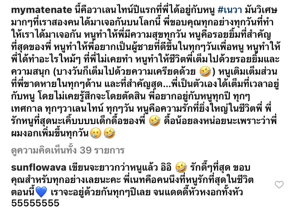 ซึ่ง @mymatenate นี้คือวาเลนไทน์ปีแรกที่พี่ได้อยู่กับหนู #เนวา มันวิเศษมากๆที่เราสองคนได้มาเจอกันบนโลกนี้ พี่ขอบคุณทุกอย่างทุกวันที่ทําให้เราได้มาเจอกัน หนูทำให้พี่มีความสุขทุกวัน หนูคือรอยยิ้มที่สำคัญที่สุดของพี่ หนูทำให้พี่อยากเป็นผู้ชายที่ดีขึ้นในทุกๆวันเพื่อหนู หนูทําให้พี่ได้ทําอะไรใหม้ๆ ที่พี่ไม่เคยทํา หนูทําให้ชีวิตพี่เต็มไปด้วยรอยยิ้มและความสนุก (บางวันก็เต็มไปด้วยความเครียดด้วย 🤣) หนูเติมเต็มส่วนที่พี่ขาดหายในทุกๆด้าน และที่สําคัญสุด…พี่เป็นตัวเองได้เต็มที่เวลาอยู่กับหนู โดยไม่เคยรู้สึกจะโดยตัดสิน พี่อยากอยู่กับหนูทุกปี ทุกๆเทศกาล ทุกๆวาเลนไทน์ ทุกๆวัน หนูคือความรักที่ยิ่งใหญ่ในชีวิตพี่ พี่รักหนูที่สุดนะเคิ้บบบบเด็กดื้อของพี่ 🤣 ดื้อน้อยลงหน่อยนะเพราะว่าพี่ผมงอกเพิ่มขึ้นทุกวัน🥲🤣