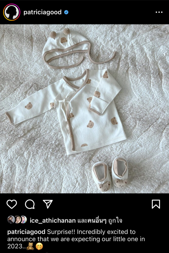 “Surprise!! Incredibly excited to announce that we are expecting our little one in 2023..” ซึ่งแปลว่า“เซอร์ไพรส์!! ตื่นเต้นมากที่เราจะประกาศว่ากำลังจะมีเจ้าตัวน้อยของเราในปี 2566″