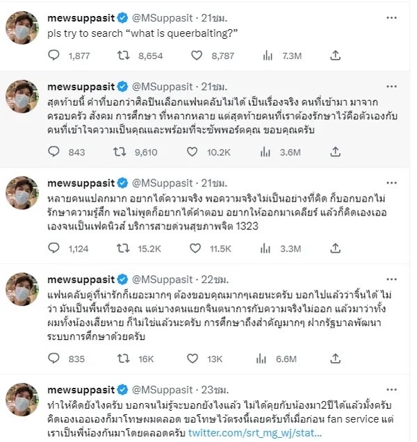 นักแสดงหนุ่ม”มิว ศุภศิษฏ์”ทวิตขอโทษแฟนคลับหากทำไม่สบายใจ ปมดราม่าพาดพิงคู่จิ้น