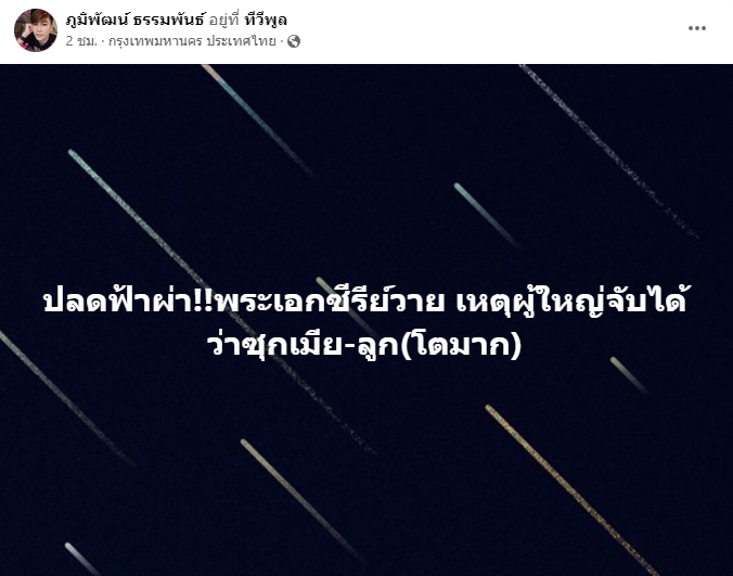 โดยล่าสุด “เต๋า ทีวีพูบล ได้โพสต์คำใบ้ลงในเฟซบุ๊คส่วนตัวระบุข้อความว่า “ปลดฟ้าผ่า!! พระเอกซีรีส์วาย เหตุผู้ใหญ่ จับได้ว่าซุกเมีย – ลูก (โตมาก)