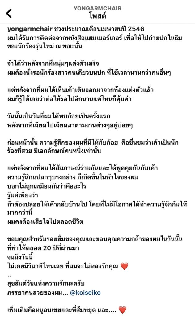 วันแรกรักอย่างไร !! วันนี้ก็ยังรักเหมือนเดิมและตลอดไปเป็นอีกหนึ่งคู่ที่มีโมเมนต์ความรักหวานๆออกมาให้ได้ยิ้มตลอดจริงๆ สำหรับ โย่ง อาร์มแชร์ และ ก้อย วลัยลักษณ์ หรือ ก้อย Saturday Seiko ที่ตอนความรักก็ยิ่งทวีคูณมากขึ้นเมื่อมีน้องอบเชย และ ส้มหยุด เข้ามาเติมเต็มครอบครัว ซึ่งล่าสุด โย่ง อาร์มแชร์ ก็ได้โพสต์ข้อความหวานซึ้งที่กลั่นออกมาจากหัวใจถึงภรรยาสุดที่รักแบบนี้