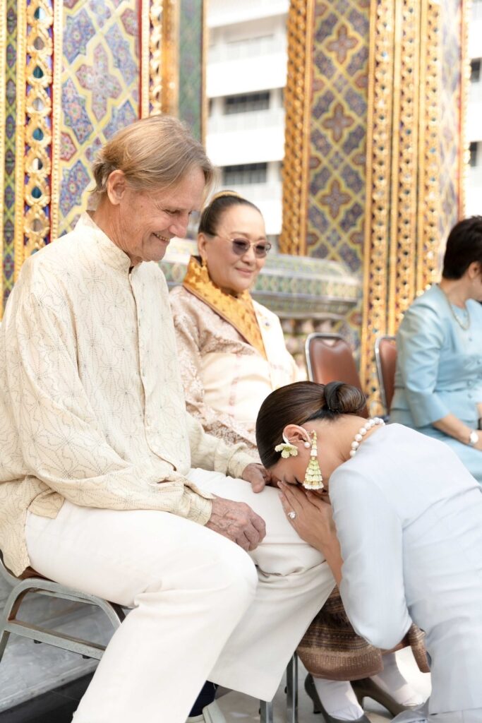 หลังจากเสร็จพิธีบ่าวสาวและครอบครัว เดินทางไปยังวัดราชบพิธสถิตมหาสิมารามราชวรวิหาร เพื่อเข้าเฝ้าขอพรจากสมเด็จพระสังฆราช สกลมหาสังฆปริณายกในเวลา 9.19 น. ตามเวลาฤกษ์ที่กำหนดไว้ เพื่อความเป็นสิริมงคลของบ่าวสาวและครอบครัว