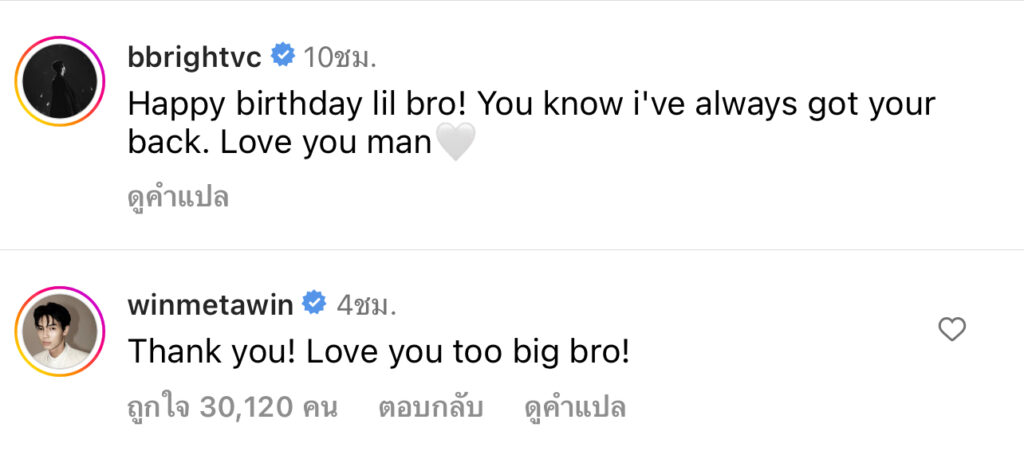 ล่าสุดทางด้านพี่ชายคนสนิทอย่าง“ไบร์ท วชิรวิชญ์ ชีวอารี“ก็ไม่พลาดวันสำคัญของคนสนิท ได้โพสต์ภาพคู่หนุ่ม วินลงในไอจี พร้อมอวยพรวันเกิดว่า “Happy birthday lil bro! You know i’ve always got your back. Love you man” ซึ่งต่อมาหนุ่ม วิน ได้เข้ามาตอบ “Thank you! Love you too big bro!” งานนี้ทำเอาแฟนคลับของทั้งคู่เข้ามากระหน่ำยอดไลน์แบบรัวๆ เรียกว่าเป็นอีกหนึ่งโมเมนต์ที่ดีต่อใจจริงๆ