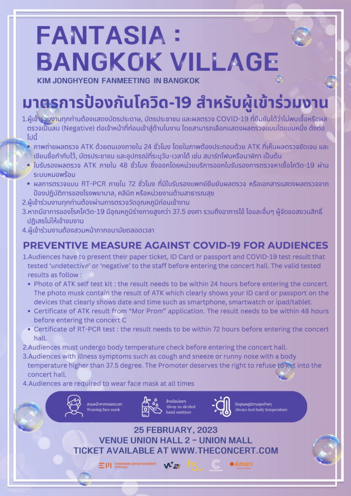 เลือกที่นั่งที่ใช่ในราคาที่ชอบ แล้วไปเจอกันที่ “คิม จงฮยอน ‘แฟนตาเซีย : แบงคอก วิลเลจ’ แฟน มีตติ้ง อิน แบงคอก” วันเสาร์ที่ 25 กุมภาพันธ์ 2566 เวลา 18.00 น. ณ ยูเนี่ยนฮอลล์ 2 ศูนย์การค้ายูเนี่ยนมอลล์ บัตรราคา 5,900 / 4,900 / 2,900 และ 1,900 บาท เริ่มเปิดจำหน่ายบัตรแล้วที่ www.theconcert.com สอบถามและติดตามข้อมูลเพิ่มเติมได้ทาง Facebook, Instagram, Tiktok และ Twitter:WP24GROUP #KJHFanMeetinginBKK2023 #FantasiaBangkokVillage #KIMJONGHYEON #Evermore #WP24Group