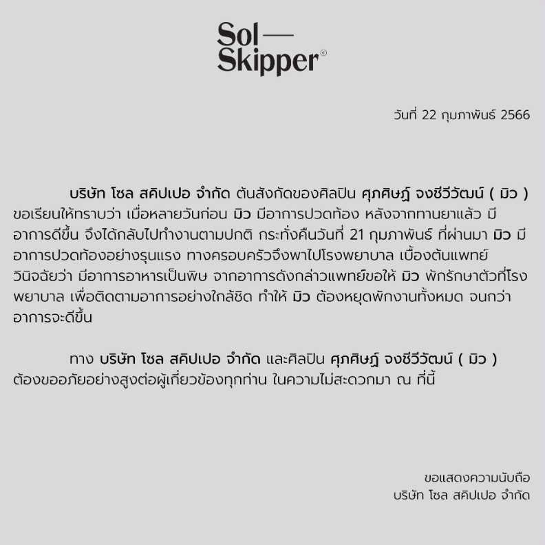 ทางบริษัท โซล สคิปเปอ จำกัด และ ศิลปิน ศุภศิษฏ์ จงชีวีวัฒน์ (มิว) ต้องขออภัยอย่างสูงต่อผู้เกี่ยวข้องทุกท่าน ในความไม่สะดวกมาณ ที่นี้”