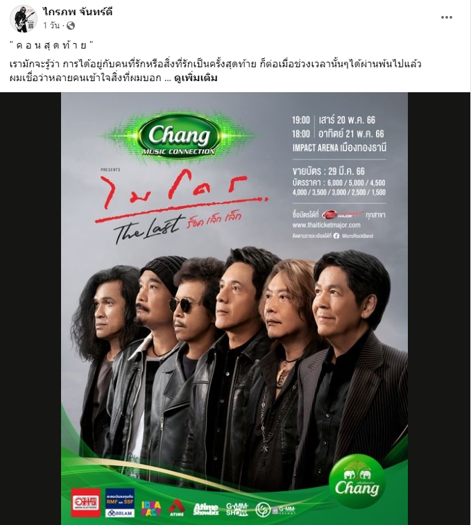 ทำเอาแฟนๆ ต่างใจหายเป็นอย่างมาก หลังวงไมโคร หนึ่งในวงร็อคระดับตำนานของเมืองไทย ที่มีสมาชิก 6 คน ได้แก่ หนุ่ม อำพล ลำพูน (ร้องนำ) , กบ ไกรภพ จันทร์ดี (กีตาร์) , อ้วน มานะ ประเสริฐวงศ์ (กีต้าร์) , บอย สันธาน เลาหวัฒนาวิทย์ (คีย์บอร์ด) , อ๊อด อดินันท์ นกเทศ (เบส) , ปู อดิสัย นกเทศ (กลอง) กำลังจะมีคอนเสิร์ตใหญ่เป็นครั้งสุดท้าย โดยล่าสุด กบ ไมโคร หรือ ไกรภพ จันทร์ดี หนึ่งในสมาชิกวงคนสำคัญของวงได้ออกมา โพสต์ผ่านเฟซบุ๊คว่า