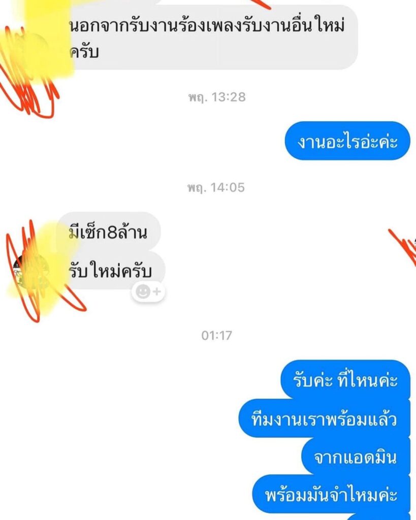 แต่ล่าสุดก็ไม่วายเจอคนทักติดต่องานผ่านเพจ ซึ่งมีแอดมนคอยตอบ แต่คุยไปคุยหา อ้าวเห้ย!!! ไม่ใช่ติดต่องานนี่หน่า เพราะว่าอีกฝ่ายดันจ้างมีเซ็กส์ แถมให้เงินสูงถึง 8 ล้านบาท งานนี้แอดมินรีบตอบกลับ ทีมงานพร้อมรับให้วางมัดจำ ทำเอาอีกฝ่ายเงียบหายไปเลยจ้า