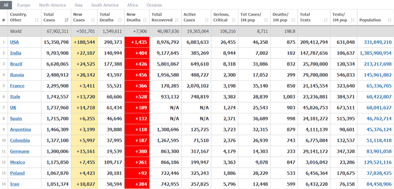 เว็บไชต์ Worldometers รายงานสถานการณ์ไวรัสโควิด-19 ประจำวันที่ 8 ธันวาคม 2563 ช่วงเวลาประมาณ 07.35 น. ตามเวลาประเทศไทย พบมีผู้ป่วยติดเชื้อทั่วโลกรวม 67,902,311 ราย เพิ่มขึ้น 501,701 ราย เสียชีวิต 1,549,611 ราย เพิ่มขึ้น 7,906 ราย รักษาหาย 46,987,636 ราย
