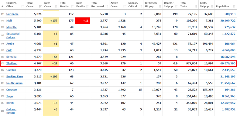 ประเทศที่พบรายงานผู้ติดเชื้อสูงสุด 5 อันดับแรก ได้แก่ 1.สหรัฐอเมริกา มีผู้ติดเชื้อ 15,350,798 ราย เพิ่มขึ้น 180,544 ราย เสียชีวิต 290,373 ราย เพิ่มขึ้น 1,435 ราย รักษาหาย 8,976,792 ราย 2.อินเดีย มีผู้ติดเชื้อ 9,703,908 ราย เพิ่มขึ้น 27,107 ราย เสียชีวิต 140,994 ราย เพิ่มขึ้น 404 ราย รักษาหาย 9,177,645 ราย 3.บราซิล มีผู้ติดเชื้อ 6,628,065 ราย เพิ่มขึ้น 24,525 ราย เสียชีวิต 177,388 ราย เพิ่มขึ้น 426 ราย รักษาหาย 5,801,067 ราย 4.รัสเซีย มีผู้ติดเชื้อ 2,488,912 ราย เพิ่มขึ้น 28,142 ราย เสียชีวิต 43,597 ราย เพิ่มขึ้น 456 ราย รักษาหาย 1,956,588 ราย 5.ฝรั่งเศส มีผู้ติดเชื้อ 2,295,908 ราย เพิ่มขึ้น 3,411 ราย เสียชีวิต 55,521 ราย เพิ่มขึ้น 366 ราย รักษาหาย 170,285 ราย ขณะที่ ประเทศเมียนมา อยู่ในลำดับที่ 68 มีผู้ติดเชื้อรวม 100,431 ราย เพิ่มขึ้น 1,276 ราย เสียชีวิต 2,132 ราย เพิ่มขึ้น 22 ราย รักษาหาย 79,240 ราย ส่วนประเทศไทยอยู่ในอันดับที่ 151 มีผู้ติดเชื้อ 4,107 ราย เพิ่มขึ้น 21 ราย เสียชีวิต 60 ราย รักษาหาย 3,868 ราย