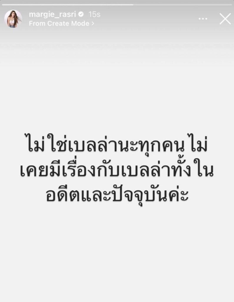 งานนี้ “มาร์กี้” เองไม่ได้นิ่งนอนใจ รีบออกมาเคลื่อนไหว โพสต์แจงผ่านไอจีสตอรี่ว่า “”ไม่ใช่เบลล่านะทุกคน ไม่เคยมีเรื่องกับเบลล่าทั้งในอดีตและปัจจุบันค่ะ“