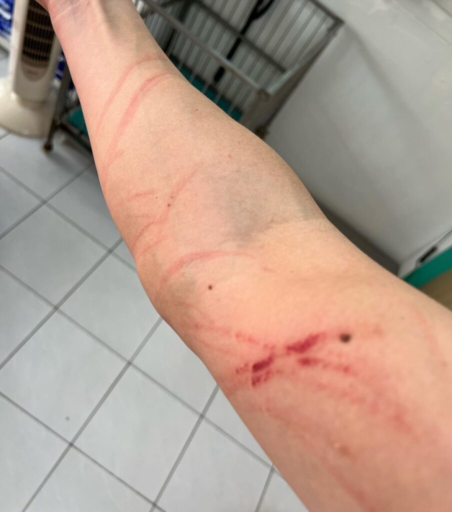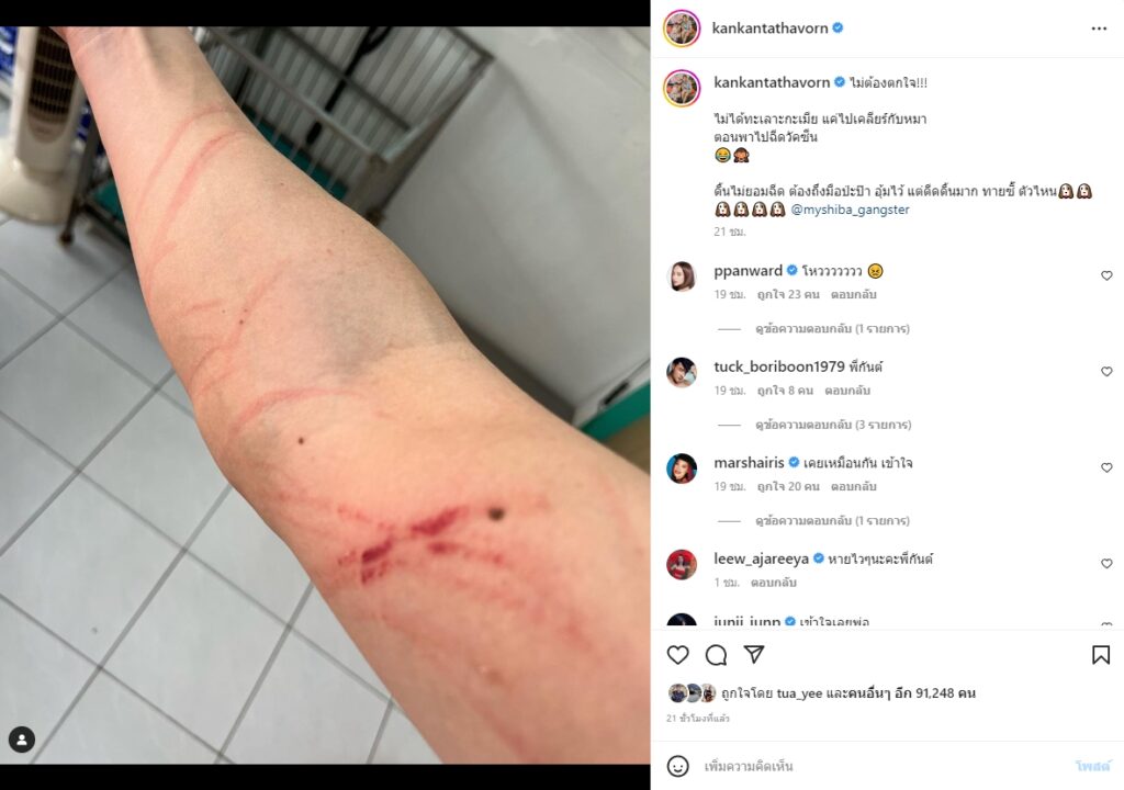 ทำเอาแฟนๆ ตกอกตกใจกันยกใหญ่ หลังพิธีกรหนุ่ม กันต์ กันตถาวร ได้โพสต์ภาพรอยช้ำที่แขนของตัวเองที่มีรอยขีดข่วนเต็มไปหมด ลงอินสตาแกรมส่วนตัว พร้อมระบุข้อความว่า “ไม่ต้องตกใจ!!! ไม่ได้ทะเลาะกะเมีย แค่ไปเคลียร์กับหมา ตอนพาไปฉีดวัคซีน ดิ้นไม่ยอมฉีด ต้องถึงมือป่ะป๊า อุ้มไว้ แต่ดีดดิ้นมาก ทายซิ๊ ตัวไหน @myshiba_gangster”