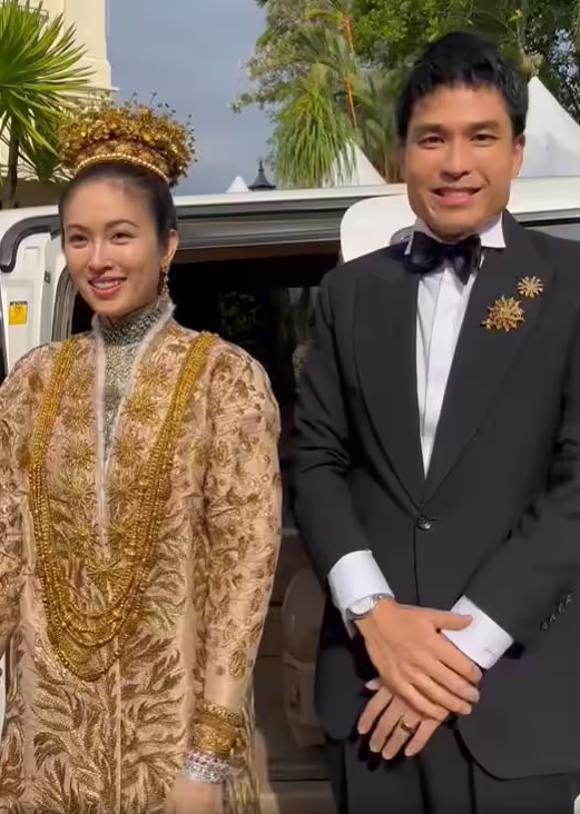 โดยเจ้าสาวอยู่ในชุดบาบ๋าแบบเจ้าสาวโบราณปักด้วยดิ้นทองคำ สวมใส่เครื่องประดับทองคำและเพชรพลอยโบราณ รวมถึงมงกุฎดอกไม้ไหว (ฮัวก๋วน) ซึ่งเป็นการขึ้นมือจากทองคำแท้ทั้งหมด ทำให้ดูสวยงามมาก ส่วนด้านเจ้าบ่าว โอ๊ค ก็มาในชุดสูทสีดำ พร้อมเข็มกลัดทอง โดยที่เป็นเอกลักษณ์หนึ่งในพิธีการแต่งงานแบบ “บ้าบ๋าย่าหยา” ดูหล่อเท่เหมาะสมกันสุดๆ