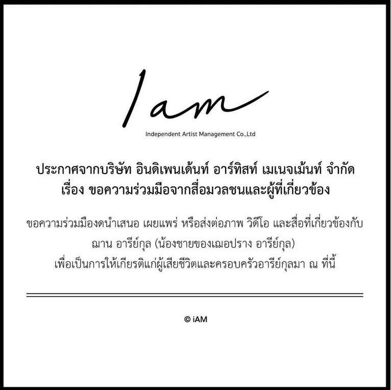 “ประกาศจากบริษัท อินดิเพนเด้นท์ อาร์ทิสท์ เมเนจเม้นท์ จำกัด เรื่อง ขอความร่วมมือจากสื่อมวลชนและผู้ที่เกี่ยวข้องขอความร่วมมืองดนำเสนอ เผยแพร่ หรือส่งต่อภาพ วิดีโอ และสื่อที่เกี่ยวข้องกับ ฌาน อารีย์กุล (น้องชายของเฌอปราง อารีย์กุล) เพื่อเป็นการให้เกียรติแก่ผู้เสียชีวิตและครอบครัวอารีย์กุลมา ณ ที่นี้”