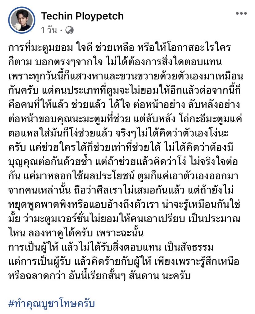 “การที่มะตูมยอม ใจดี ช่วยเหลือ หรือให้โอกาสอะไรใครก็ตาม บอกตรงๆจากใจ ไม่ได้ต้องการสิ่งใดตอบแทน เพราะทุกวันนี้ก็แสวงหาและขวนขวายด้วยตัวเองมาเหมือนกันครับ แต่คนประเภทที่ตูมจะไม่ยอมให้อีกแล้วต่อจากนี้ก็คือคนที่ให้แล้ว ช่วยแล้ว ได้ใจ ต่อหน้าอย่าง ลับหลังอย่าง ต่อหน้าขอบคุณนะมะตูมที่ช่วย แต่ลับหลัง โถ่กะอีมะตูมแค่ตอแหลใส่มันก็โง่ช่วยแล้ว