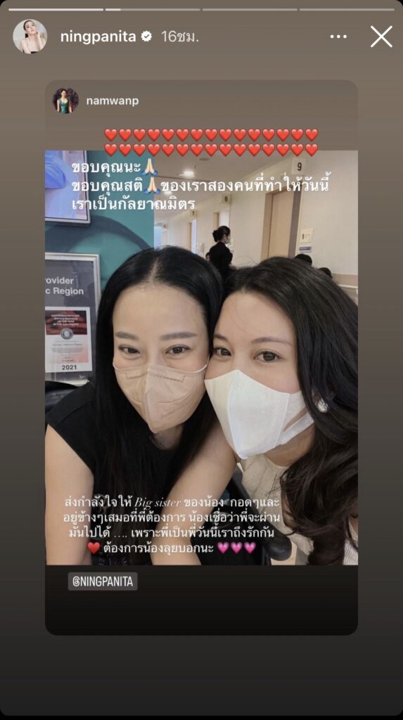 “ขอบคุณนะ ขอบคุณสติของเราสองคนทำให้วันนี้เป็นกัลยาณมิตร ส่งกำลังใจให้ Big sister ของน้อง กอดๆ และอยู่ข้างๆ เสมอที่พี่ต้องการ น้องเชื่อว่าพี่จะผ่านมันไปได้…เพราะพี่เป็นพี่วันนี้เราถึงรักกัน ต้องการน้องลุยบอกนะ”