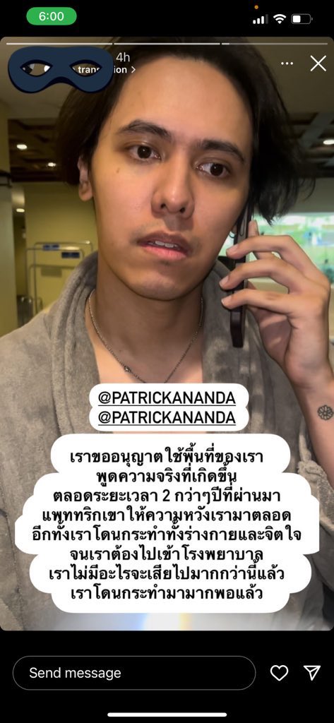 โดยได้มีการโพสต์ไอจีสตรอรี่ระบุว่า “เราขออนุญาตใช้พื้นที่ของเรา พูดความจริงที่เกิดขึ้นตลอดระยะเวลา 2 กว่าๆปีที่ผ่านมา แพททริกเขาให้ความหวังเรามาตลอด อีกทั้งเราโดนกระทำทั้งร่างกายและจิตใจ จนเราต้องไปเข้าโรงพยาบาล เราไม่มีอะไรจะเสียไปมากกว่านี้แล้ว เราโดนกระทำมามากพอแล้ว”