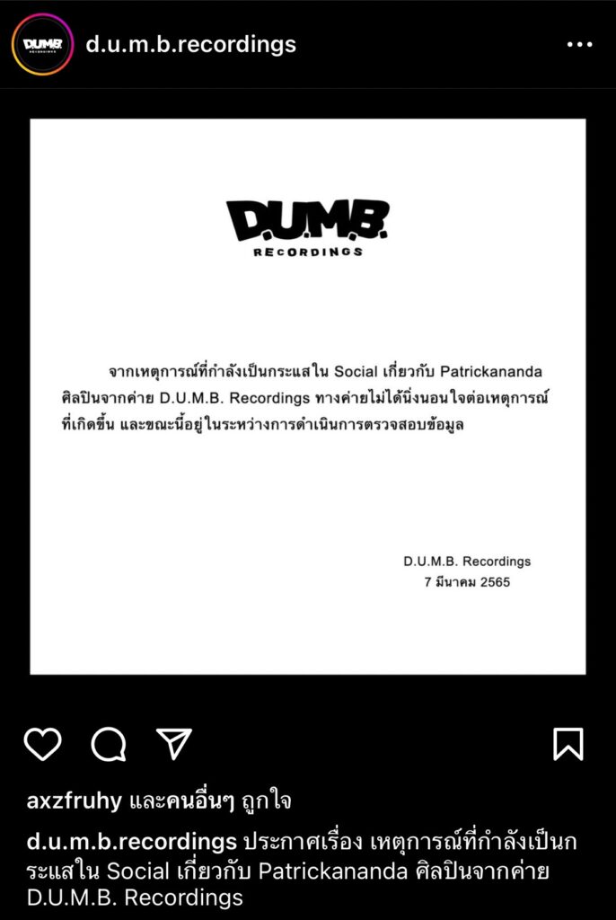 จากนั้นต้นสังกัดของ “แพททริค” ได้ออกแถลงการณ์ระบุว่า “จากเหตุการณ์ที่กำลังเป็นกระแสใน Social เกี่ยวกับPatrickananda ศิลปินจากค่าย D.U.M.B. Recordings ทางค่ายไม่ได้นิ่งนอนใจต่อเหตุการณ์ที่เกิดขึ้น และขณะนี้อยู่ในระหว่างการดำเนินการตรวจสอบข้อมูล”
