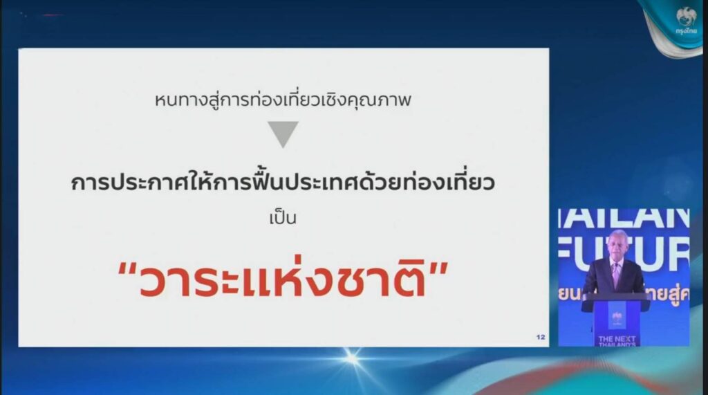 รายได้จากการท่องเที่ยวจะต้องเพิ่มเป็นร้อยละ 25 ของ GDP หรือคิดเป็นมูลค่า 6 ล้านล้านบาทนั้น ในวันที่ 14 มีนาคมนี้ กระทรวงการท่องเที่ยวและกีฬาจะเสนอที่ประชุมคณะรัฐมนตรี ประกาศให้การฟื้นประเทศด้วยท่องเที่ยว เป็นวาระแห่งชาติ เพื่อทำให้การเดินหน้าไปสู่เป้าหมายประสบความสำเร็จเนื่องจากการฟื้นอุตสาหกรรมการท่องเที่ยวไม่สามารถทำได้ด้วยหน่วยงานเดียว ความร่วมมือระหว่างหน่วยงานทั้งภาครัฐและเอกชนมีความจำเป็นที่จะต้องทำร่วมกัน
