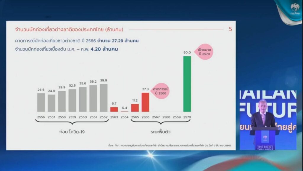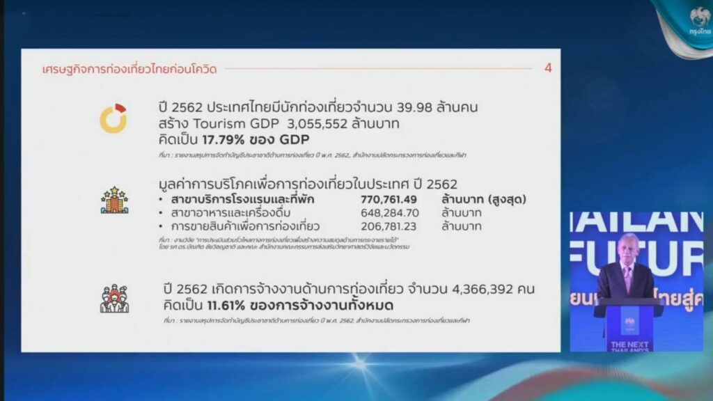 ในงาน The NEXT Thailand’s Future : จุดเปลี่ยนประเทศไทยสู่ความยั่งยืน นายพิพัฒน์ รัชกิจประการ รัฐมนตรีว่าการกระทรวงการท่องเที่ยวและกีฬา เปิดเผยว่า อุตสาหกรรมการท่องเที่ยวเวลานี้กำลังฟื้นตัวอย่างต่อเนื่อง หลังจากประเทศไทยมีการผ่อนคลายมาตรการและเปิดประเทศอย่างเต็มรูปแบบในปีที่ผ่านมา ซึ่งในปีนี้ คาดการณ์ว่าจำนวนนักท่องเที่ยวจะอยู่ที่ 25-30 ล้านคน สร้างรายได้ 2.4 ล้านล้านบาท และจากเป้าหมายที่สภาพัฒนาการเศรษฐกิจและสังคมแห่งชาติ หรือ สศช. กำหนด ภายในปี 2570