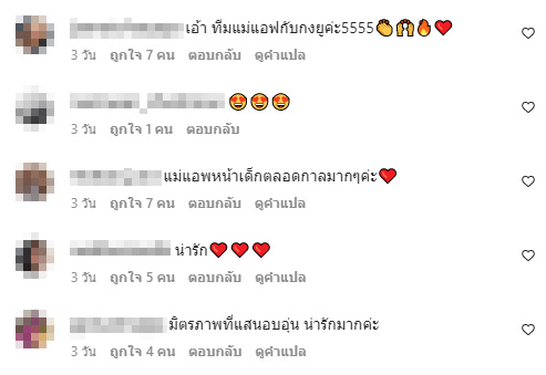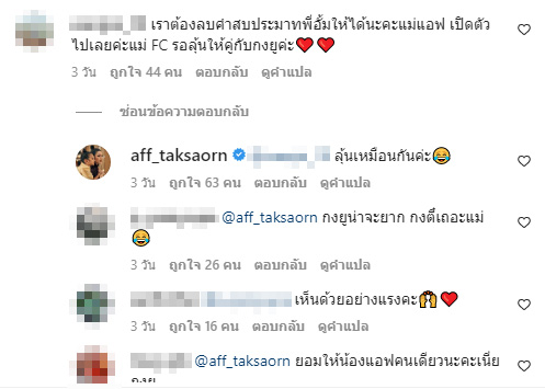 งานนี้เองทำให้เหล่าคนที่รักแม่ “แอฟ ทักษอร” เข้ามาแซวยกใหญ่กัน อาทิ “เอ้า ทีมแม่แอฟกับกงยูค่ะ5555” “เราต้องลบคำสบประมาทพี่อั้มให้ได้นะคะแม่แอฟ เปิดตัวไปเลยค่ะแม่ FC รอลุ้นให้คู่กับกงยูค่ะ,คนนี้สวยหวานไปทุกส่วน,แม่แอฟหน้าเด็กตลอดการมากๆค่ะ”