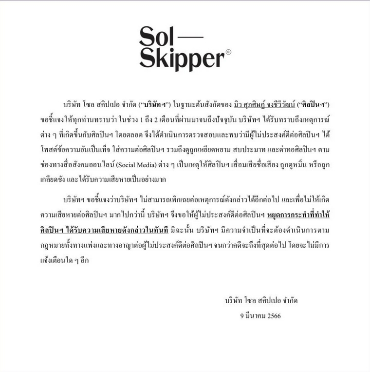 โดยมีข้อความว่า “บริษัท โซล สคิปเปอ จำกัด ในฐานะต้นสังกัดของ มิว ศุภศิษฏ์ จงชีวีวัฒน์ ขอชี้แจงให้ทุกท่านทราบว่าในช่วง 1 ถึง 2 เดือนที่ผ่านมา จนถึงปัจจุบัน บริษัทฯได้รับทราบถึงเหตุการณ์ต่างๆ ที่เกิดขึ้นกับศิลปินฯ โดยตลอด จึงได้ดำเนินการตรวจสอบและพบว่ามีผู้ไม่ประสงค์ดีต่อศิลปิน ได้โพสต์ข้อความอันเป็นเท็ก ใส่ความต่อศิลปิน รวมถึงดูถูกเหยียดหยาม สบประมาท และด่าทอศิลปิน ตามช่องทางสื่อสังคมออนไลน์ต่าง ๆ เป็นเหตุให้ศิลปิน เสื่อมเสียชื่อเสียง ถูกดูหมิ่น หรือถูกเกลียดชัง และได้รับความเสียหายเป็นอย่างมาก