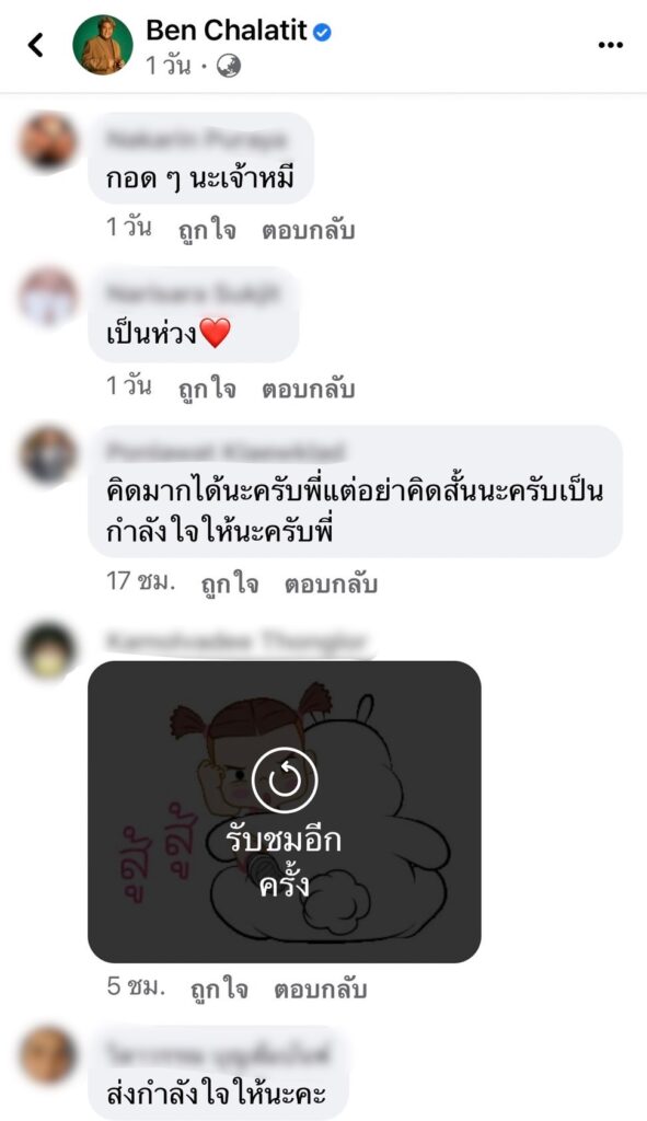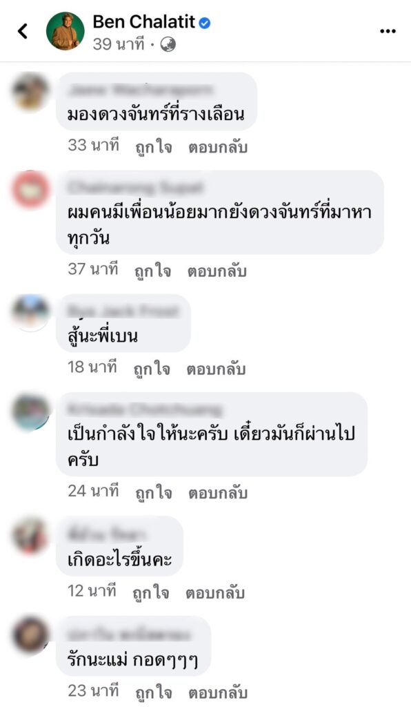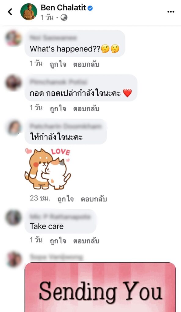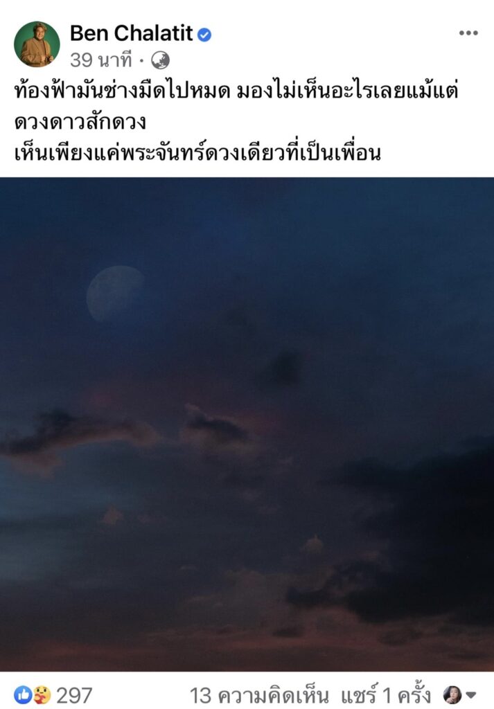 โดยลงภาพท้องฟ้าแบบอึมครึม พร้อมระบุข้อความว่า “ท้องฟ้ามันช่างมืดไปหมด มองไม่เห็นอะไรเลย แม้แต่ดวงดาวสักดวง เห็นเพียงแค่พระจันทร์ดวงเดียวที่เป็นเพื่อน” ทำให้แฟนเพลงอดเป็นห่วงไม่ได้ พร้อมส่งกำลังใจอย่างล้นหลามใต้คอมเมนต์ เช่น ส่งกำลังใจให้นะคะ, กอด รักนะคะ, เป็นห่วง, กอดๆ นะเจ้าหมี, เป็นไรเน้อ, Take Care, ห่วงแม่, ส่งกำลังใจคับพี่เบน, เหงาก็ร้องเพลงเบาๆในใจค่ะ, พี่เบนเค้าจะโปรโมทเพลง พี่เค้าไม่เหงาหรอก มีคนน่ารักอยู่ข้างกาย บ้างคอมเมนต์ก็เสนอวิธีคลายเหงา