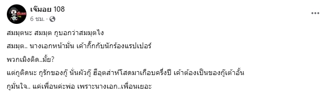 “สมมตินะ สมมติ ฉันบอกว่าสมมติไง สมมติ.. นางเอกหน้ามั่น เขากิ๊กกับนักร้องแร็ปเปอร์ พวกเมิงติด..ไหม? แต่ฉันติดนะ ฉันรักของฉัน นั่นผัวฉัน ฮีอุตส่าห์โสดมาเกือบครึ่งปี เขาต้องเป็นของฉันเต้าอั้น ฉันมั่นใจ.. แค่เพื่อนค่ะพ่อ เพราะนางเอก..เพื่อนเยอะ”