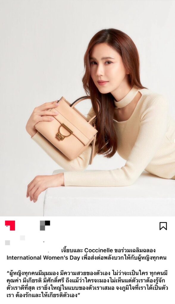 เจี๊ยบ และ Coccinelle ขอร่วมเฉลิมฉลอง International Women’s Day เพื่อส่งต่อพลังบวกให้กับผู้หญิงทุกคน “ผู้หญิงทุกคนมีมุมมอง มีความสวยของตัวเอง ไม่ว่าจะเป็นใคร ทุกคนมีคุณค่า มีเกียรติ มีศักดิ์ศรี ถึงแม้ว่าใครจะมองไม่เห็นแต่ตัวเราต้องรู้จักตัวเราดีที่สุด เรายิ่งใหญ่ในแบบของตัวเราเสมอ จงภูมิใจที่เราได้เป็นตัวเรา ต้องรักและให้เกียรติตัวเอง”