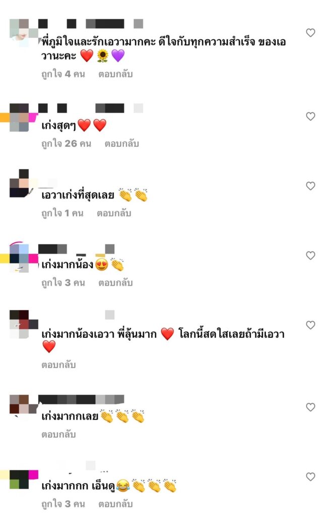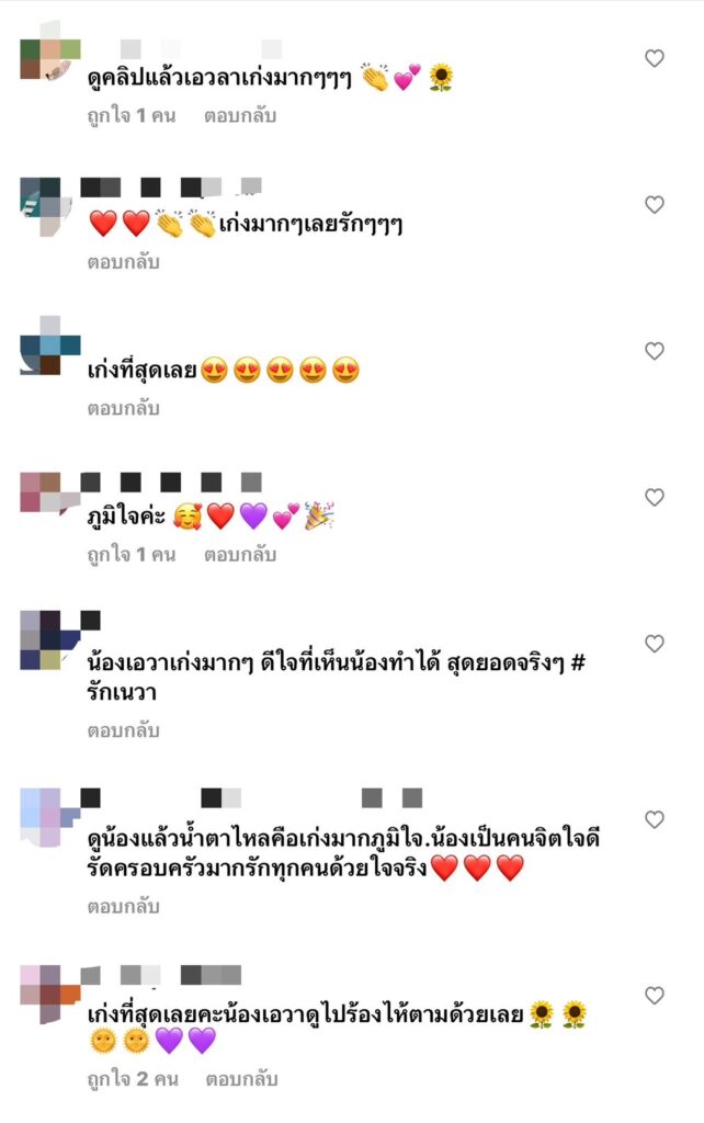 งานนี้แฟนๆต่างพากันเข้าไปกดหัวใจเพื่อเป็นกำลังในภาระกิจนี้ที่ เอวา ทำกันอย่างล้นหลาม พร้อมกับคอมเมนต์ชื่นชม เอวา เป็นเสียงเดียวกันว่า เอวาเก่งมาก , เก่งสุดเลยค่ะน้องเอวาดูไปน้ำตาไหลไปตามด้วยเลย , ภูมิใจในตัวของเอวา