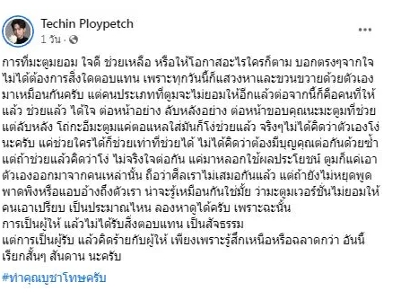 “จริงๆไม่ได้ฟาดเลย เราแค่พูดในมุมที่เวลาช่วยใครไปด้วยความบริสุทธิ์ใจแล้วเขาไม่เห็นคุณค่าเราไม่ได้โกธร แต่ถ้าเอาเราไปพูดต่อในเวอร์ชั่นที่ลดท่อนคุณค่าเราตูมอยากให้หยุดเลยโพสต์ไปแบบนั้น ซึ่งเจตนาการโพสต์ไม่ได้ต้องการให้มันเป็นเรื่องใหญ่โต แต่แค่อยากจะสื่อสารให้เขาได้เห็นแค่นั้นเลยเพราะเป็นเพื่อนกันในเฟสบุ๊คเป็นคนนอกวงการ ส่วนตัวไม่ได้นอยด์กับสิ่งที่เขาพูด ตอนนี้ก็ขอไม่ยุ่งแล้วกัน ตอนที่ช่วยคือช่วยทั้งคอนเนคชั่นและเงิน
