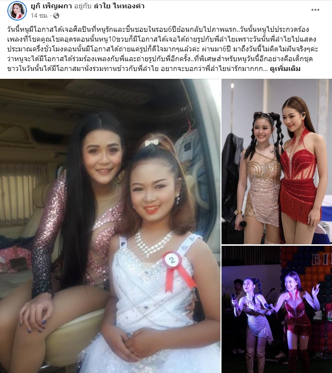 หลังจากขึ้นแท่นเป็นศิลปินสาวสังกัดค่ายไหทองคำเต็มตัว สำหรับ หมอลำสาวสวย “ยูกิ เพ็ญผกา” ล่าสุดเจ้าตัวมีโอกาสได้ร่วมงานกับไอดอลในดวงใจตั้งแต่เด็ก อย่าง ลำไย ไหทองคำ งานนี้ยูกิถึงกับปลื้มสุดๆ พร้อมโพสต์ภาพแรกคู่กับสาวลำไย เมื่อตอนอายุ 10 ขวบ และเล่าความประทับใจลงเฟซบุ๊กส่วนตัวหลังผ่านมา 6 ปีว่า