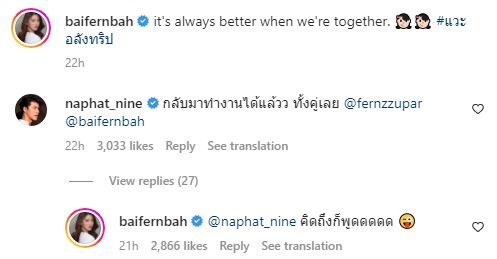 โดยนางเอกสาวโพสต์ว่า “it’s always better when we’re together. #แวะอลังทริป” ซึ่งก็มีชาวเน็ตต่างเข้ามาคอนเมนต์มากมาย แต่!!! จู่ๆคนคลั่งรักอย่าง นาย ณภัทร ก็เข้ามาคอมเมนต์ว่า “กลับมาทำงานได้แล้วว ทั้งคู่เลย @fernzzupar @baifernbah” และแน่นอนคนรักเขารู้กันรีบตอบกลับไปแบบเขินๆว่า “คิดถึงก็พูดดดดด” ท่ามกลางชาวเน็ตที่เข้ามาคอมเมนต์แซวความหวานของทั้งคู่กันอย่างล้นหลาม