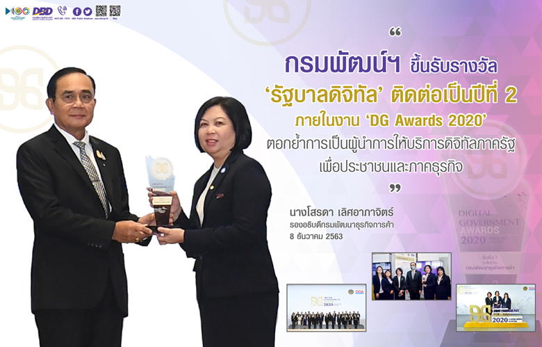 โดยกรมพัฒนาธุรกิจการค้า เป็น 1 ใน 10 หน่วยงานระดับกรมที่ได้รับรางวัลในปีนี้ ทั้งนี้ เมื่อปีที่ผ่านมากรมฯ ก็ได้รับรางวัลชนะเลิศ รางวัลรัฐบาลดิจิทัล (DG Awards 2019) ด้วยคะแนนสูงสุด และเป็น 1 ใน 5 หน่วยงานที่ได้รับรางวัลต่อเนื่อง 2 ปีซ้อน การันตีถึงความมุ่งมั่นของกรมฯ ในการยกระดับการให้บริการเพื่ออำนวยความสะดวกแก่ภาคธุรกิจและประชาชนผ่านระบบดิจิทัล เป็นการสนับสนุนและเอื้อต่อการประกอบธุรกิจ พร้อมผลักดันให้ภาคธุรกิจและประชาชนเข้าสู่การใช้เทคโนโลยีหรือทำธุรกรรมผ่านทางอิเล็กทรอนิกส์มากขึ้น ซึ่งจะเป็นการช่วยประหยัดเวลาและค่าใช้จ่าย รวมทั้ง สามารถนำเอกสารดังกล่าวไปดำเนินการหรือติดต่อกับหน่วยงานอื่นได้อย่างรวดเร็ว นอกจากนี้ กรมฯ ได้มีการนำ Big Data เข้ามาช่วยอำนวยความสะดวกแก่ภาคธุรกิจ หน่วยงานภาครัฐ และประชาชนทั่วไป ซึ่งจะเป็นการช่วยขับเคลื่อนการปฏิบัติราชการไปสู่รัฐบาลดิจิทัลได้รวดเร็วมากยิ่งขึ้น