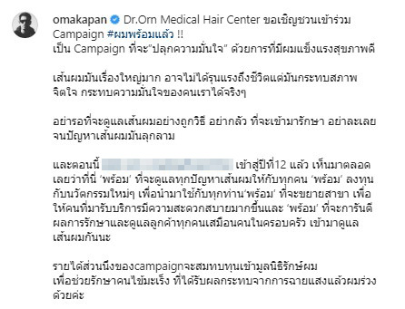 ล่าสุดเจ้าตัว ได้ออกมาเคลื่อนไหวผ่านอินสตาแกรมส่วนตัว ให้แฟนๆหายคิดถึง ด้วยการออกมาโพสต์เชิญชวนแฟนคลับ และผู้มีจิตศรัทธา เข้าแคมเปญ Dr.Orn Medical Hair Center โดยมีรายละเอียดว่า “ขอเชิญชวนเข้าร่วม Campaign #ผมพร้อมแล้ว !!เป็น Campaign ที่จะ”ปลุกความมั่นใจ ด้วยการที่มีผมแข็งแรงสุขภาพดี รายได้ส่วนนึงของcampaignจะสมทบทุนเข้ามูลนิธิรักษ์ผมเพื่อช่วยรักษาคนไข้มะเร็ง ที่ได้รับผลกระทบจากการฉายแสงแล้วผมร่วงด้วยค่ะ #ผมพร้อมแล้ว #เรื่องผมครบจบที่DrOrn #drornmedicalhaircenter”